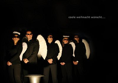 Aber für die Weihnachtskarte 2008 haben wir unsere großen schwarzen Sonnenbrillen aus der Schublade geholt und unser finsterstes Gesicht aufgesetzt - schwarze Engel wünschen ein cooles Weihnachtsfest - mit viel Schnee zum Skifahren, Eis zum Schlittschulaufen und Glühwein zum Aufwärmen.
